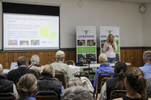 Before the group headed to the field, Kim Nielsen delivered an engaging presentation on the 4 Clover Ranch, established in 1992. Using maps and decades of pasture data, Nielsen detailed his rotational grazing strategy and contrasted paddocks using synthetics with one paddock left untouched for over 40 years.