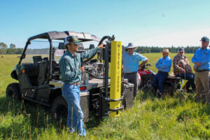 After lunch at Arbutus Community Hall, the group made their way to 4 Clover Ranch for an up-close look at Nielsen’s grazing systems and soil health strategies in practice. The afternoon featured a series of field demonstrations, including a soil sampling session led by CAFLA’s Reid Caukill using an automatic soil probe. Attendees examined the distinctive Canadian grey wooded soil, engaging in hands-on tests like water infiltration and aggregate stability to better understand soil structure and function.